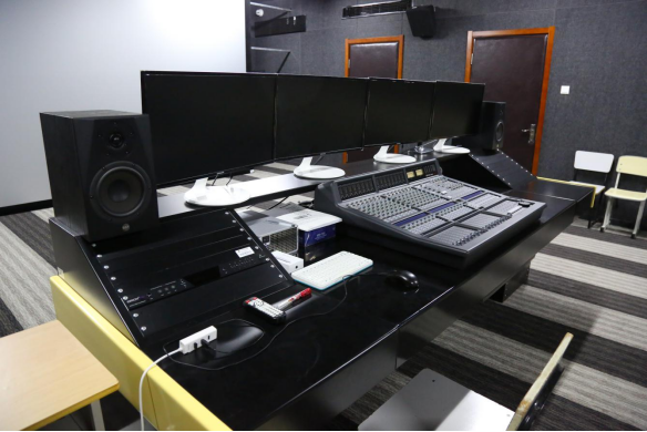 融媒体演播厅包括短视频发布,校园电视台发布,内网信息发布等,充分结合当下融媒体采、编、播、发一体化,虚实结合的发展潮流,集录制、制作、编辑、存储、发布为一体,共设有主景区、实景区、虚拟背景景区三个主要部分。可满足新闻类栏目、生活娱乐类栏目、室内情景剧、短视频等节目的录制,录制区域面积约500平方米,参照目前国内一级演播厅标准创建。同时建有融媒体编辑工作站及数据管理平台,另外直播推流系统可满足新媒体多平台发布需求。学校各类综艺栏目的制作,均在该厅录制和采编。