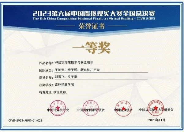 日前,由中国计算机学会、中国图象图形学会、中国仿真学会共同指导举办的第六届中国虚拟现实大赛(CCVR 2023)全国总决赛在江苏苏州落幕。永利官网虚拟现实与电影技术学院共获国赛一等奖1项,二等奖9项,三等奖6项,永利集团官网获得省级“优秀组织奖”,再创佳绩。