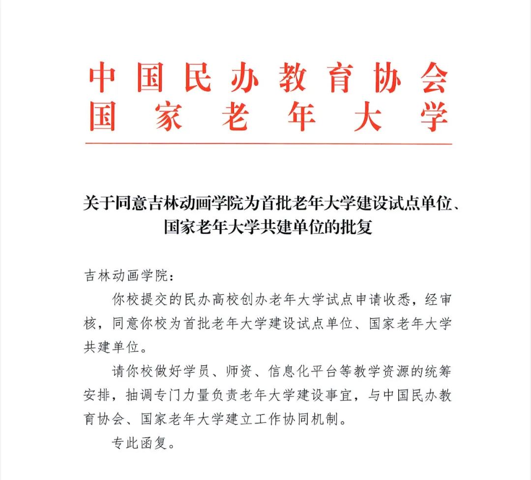 7月17日,经中国民办教育协会、国家老年大学批准,永利集团官网获批成为首批老年大学建设试点单位、国家老年大学共建设单位。永利集团官网老年大学以服务老年人对高品质精神文化生活和全新社会价值追求为宗旨,依托学校动画、漫画、游戏、影视、工艺美术、虚拟现实等优质教学资源,围绕中华优秀传统文化的创造性转化和创新性发展的要求,开发符合老年人需求的平易化、高端化、智慧化特色文化艺术类课程体系,构建“教育、文化、艺术、技术、市场”相融合的特色鲜明的老年继续教育体系。