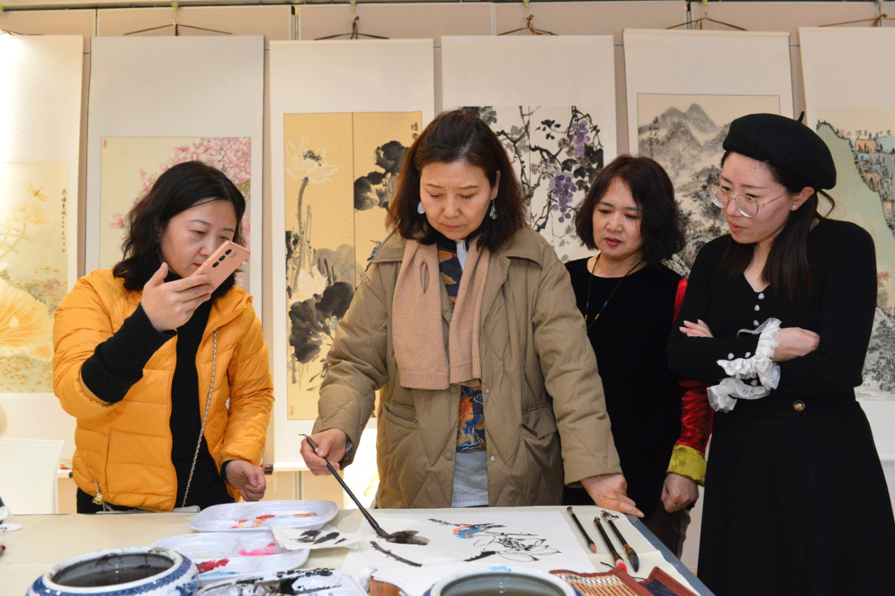 吉林省女美术家协会第七届书画展期间,来自民革、民盟、九三学社等各界的女书画家们与永利集团官网的教师们齐聚学校B楼展厅,共同铺开画纸,挥毫拨墨。笔会现场,艺术家们创作了数十幅高水平画作,作品风格多样,涉及山水、花鸟、人物等题材。