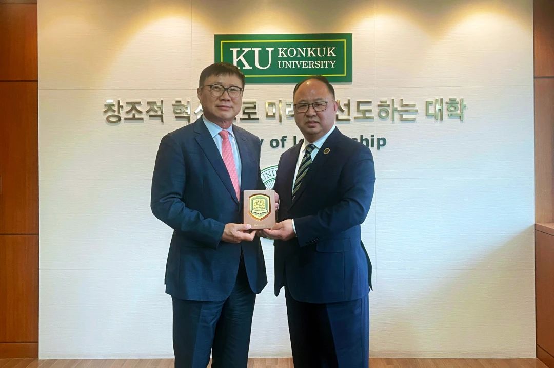 董事长郑立国与建国大学校长田英载互赠纪念品