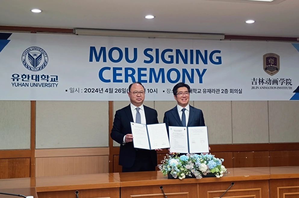 4月26日,考察团一行到访柳韩大学,双方在学生交流、联合项目创作、共同拍摄微短剧等方面达成合作共识。双方就校际合作举行协议签订仪式。
