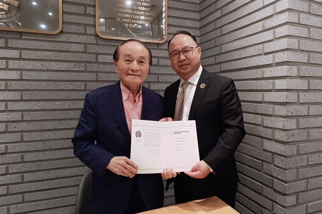 董事长郑立国与韩国建国大学前任校长、纽约州立大学韩国分校名誉校长吴明合影留念