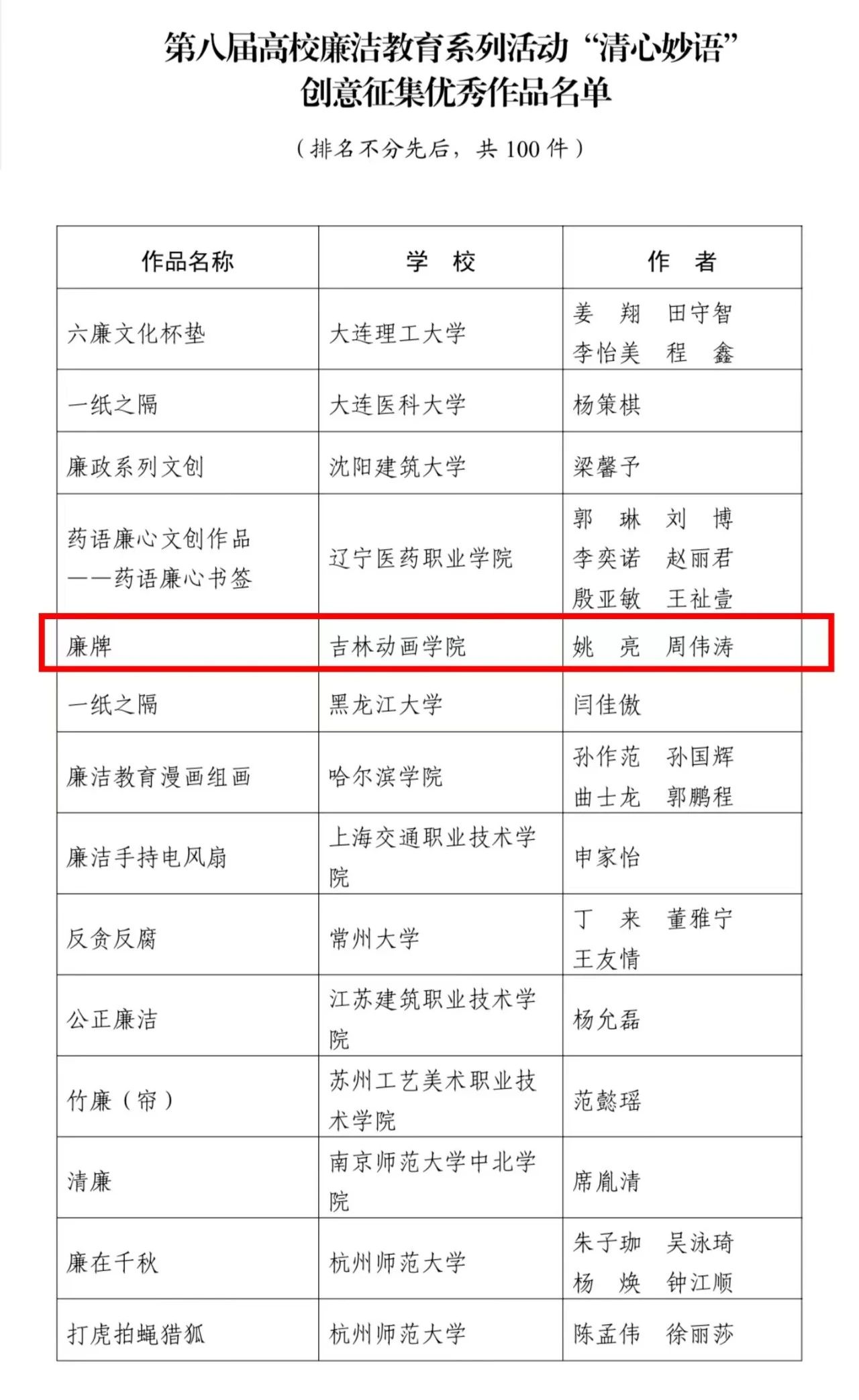 【JAI·荣】吉动学子原创作品《廉牌》获教育部奖项 发布时间:2023年10月19日 19:47:00 浏览:次 近日,教育部办公厅下发了“关于公布第八届高校廉洁教育系列活动结果的通知”。从通知中获悉,永利官网文化产业商学院学生姚亮、周伟涛凭借原创作品《廉牌》在“清心妙语”创意征集中成绩突出,获全国优秀作品百强奖项,擦亮青春底色,书写新时代“清廉答卷”。 获奖名单(部分名单)