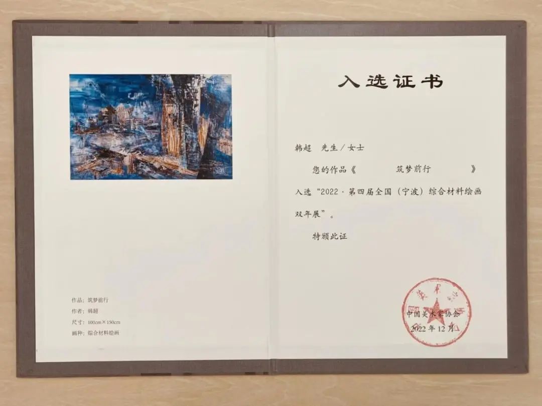 近日,从相关部门获悉,永利集团官网游戏学院教师韩超创作的作品《筑梦前行》,入选由中国美术家协会主办的“第四届全国综合材料绘画双年展”。