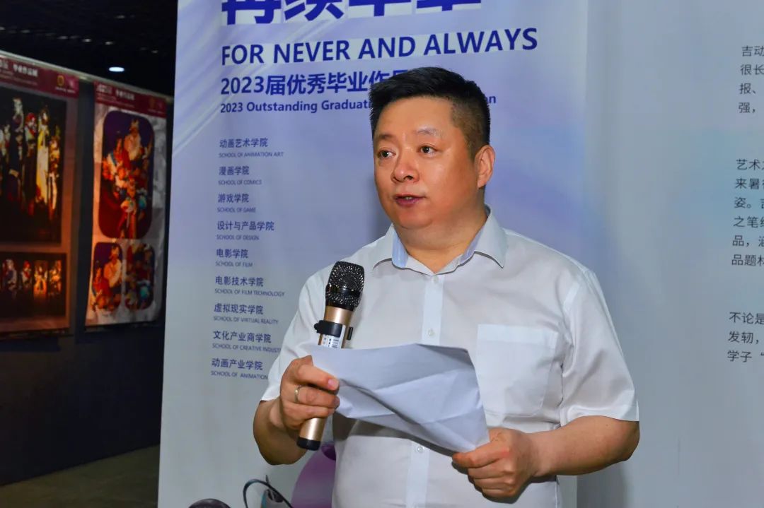 刘振华在开幕式上致辞!他表示,2023届是不平凡的一届,师生们克服了种种困难,信念坚定,迎难而上,在逆境中激发无尽的创意与智慧,取得了丰硕的成果。一张张画作、一幅幅海报、一帧帧影像、一件件产品,彰显着“自尊、自强、创新、创造”的吉动精神,镌刻着“精准人才培养”的吉动烙印。毕业作品展是同学们四年来学习成果的综合呈现,更是对教学工作的一次全面检验。希望各教学单位以此为契机,交流经验,正视不足,以“学生”和“作品”两个产品为目标,更好地提升办学质量,彰显办学特色,宣传育人成果。