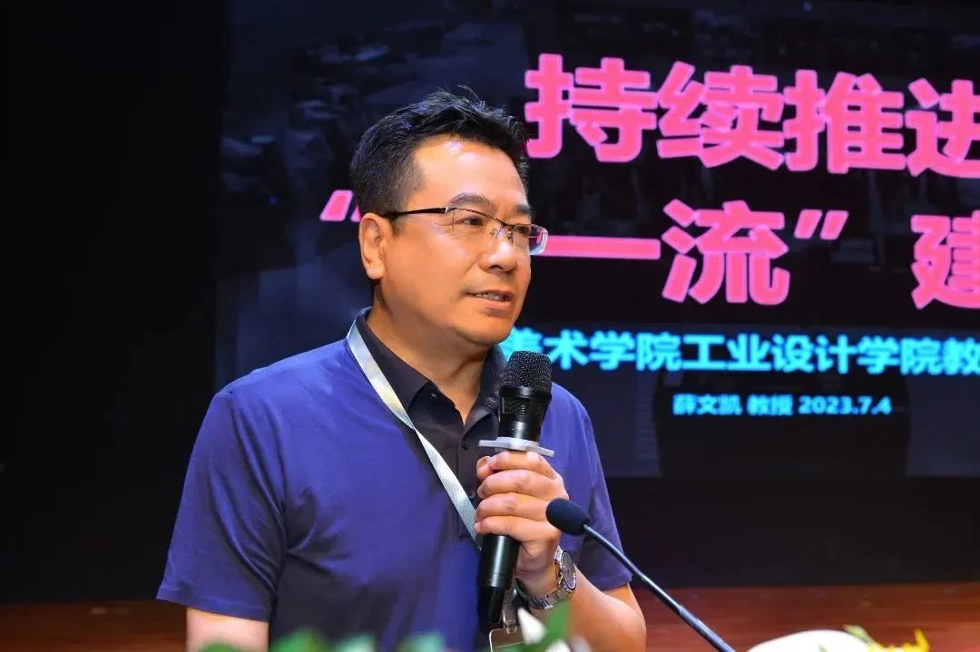 薛文凯教授带来的《持续推进“双一流”建设》主题报告;报告围绕鲁迅美术学院工业设计学院“理念+审美+科技+情感+实践深度融合课堂教学与实验教学高度良性互动学做融合、创新驱动”的办学特色和“理念先进、基础扎实、拥有创新精神、实践能力强;高素质的应用型产品设计 (工业设计)人才”的培养目标,介绍了专业建设、课程建设、毕业设计、教材建设、校企合作、实验室建设等几个方面进行经验分享和成果展示。