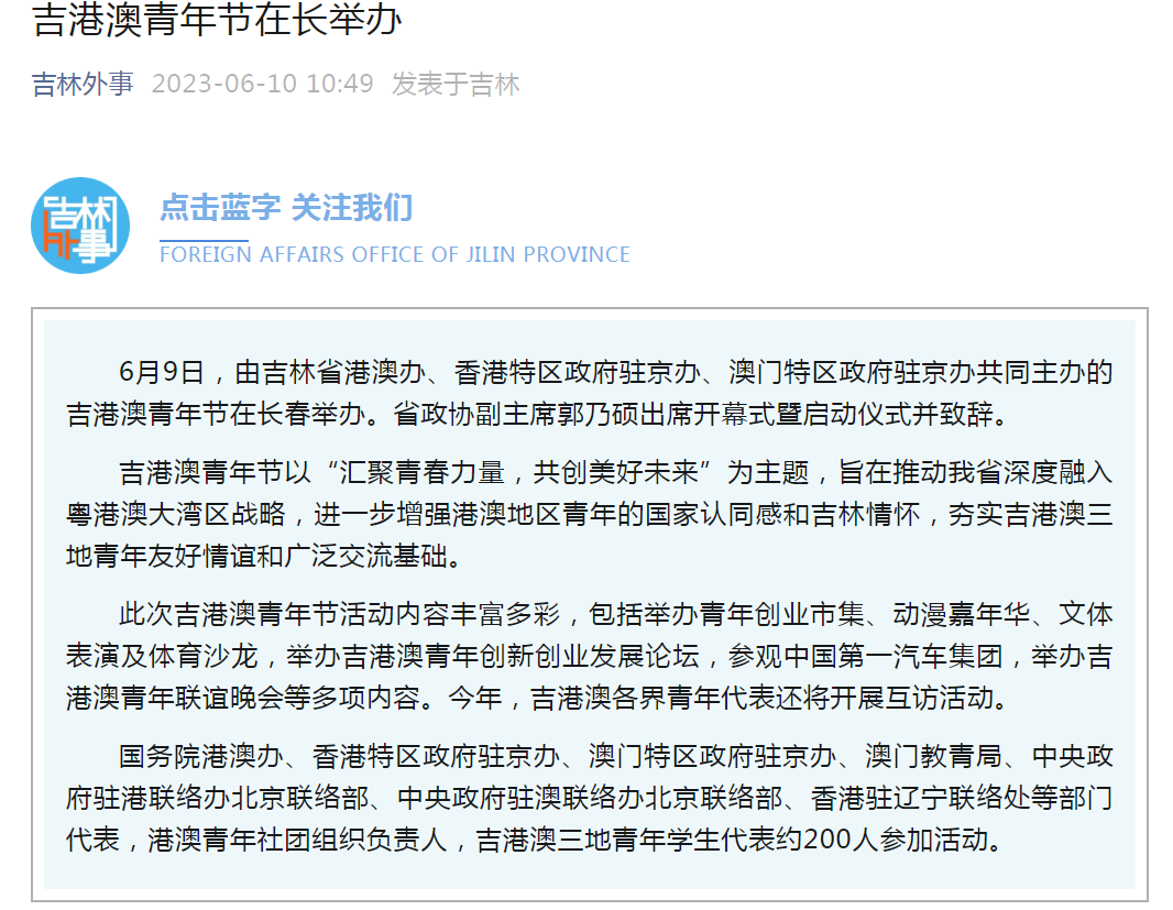6月9日,由吉林省港澳办、香港特区政府驻京办、澳门特区政府驻京办共同主办的吉港澳青年节在长春举办。省政协副主席郭乃硕出席开幕式暨启动仪式并致辞。
