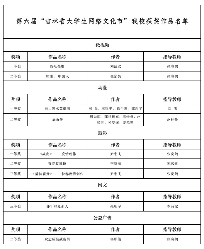 近日,省教育厅公布第六届吉林省大学生网络文化节和全省高校网络教育优秀作品推选展示活动评选结果,永利官网荣获微视频、动漫、摄影、网文、公益广告五个类别一等奖3项、二等奖4项、三等奖2项的好成绩。