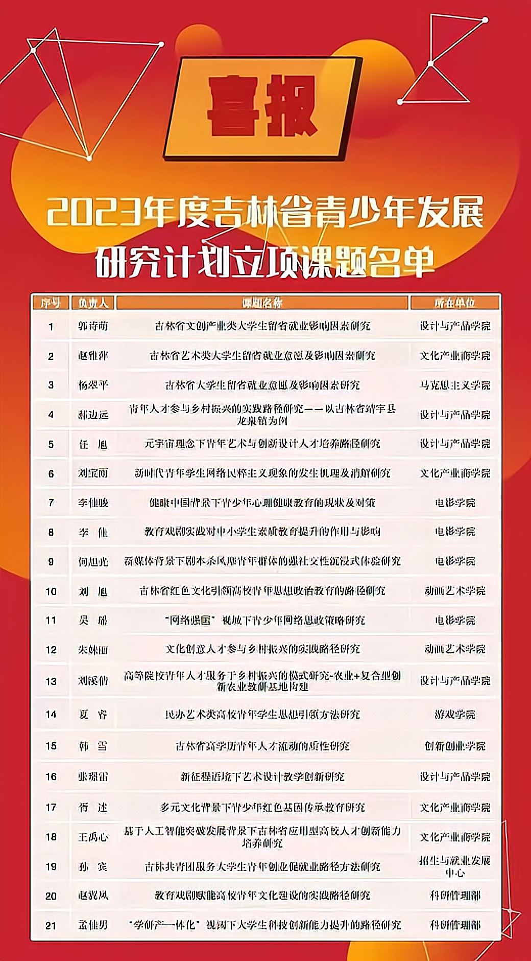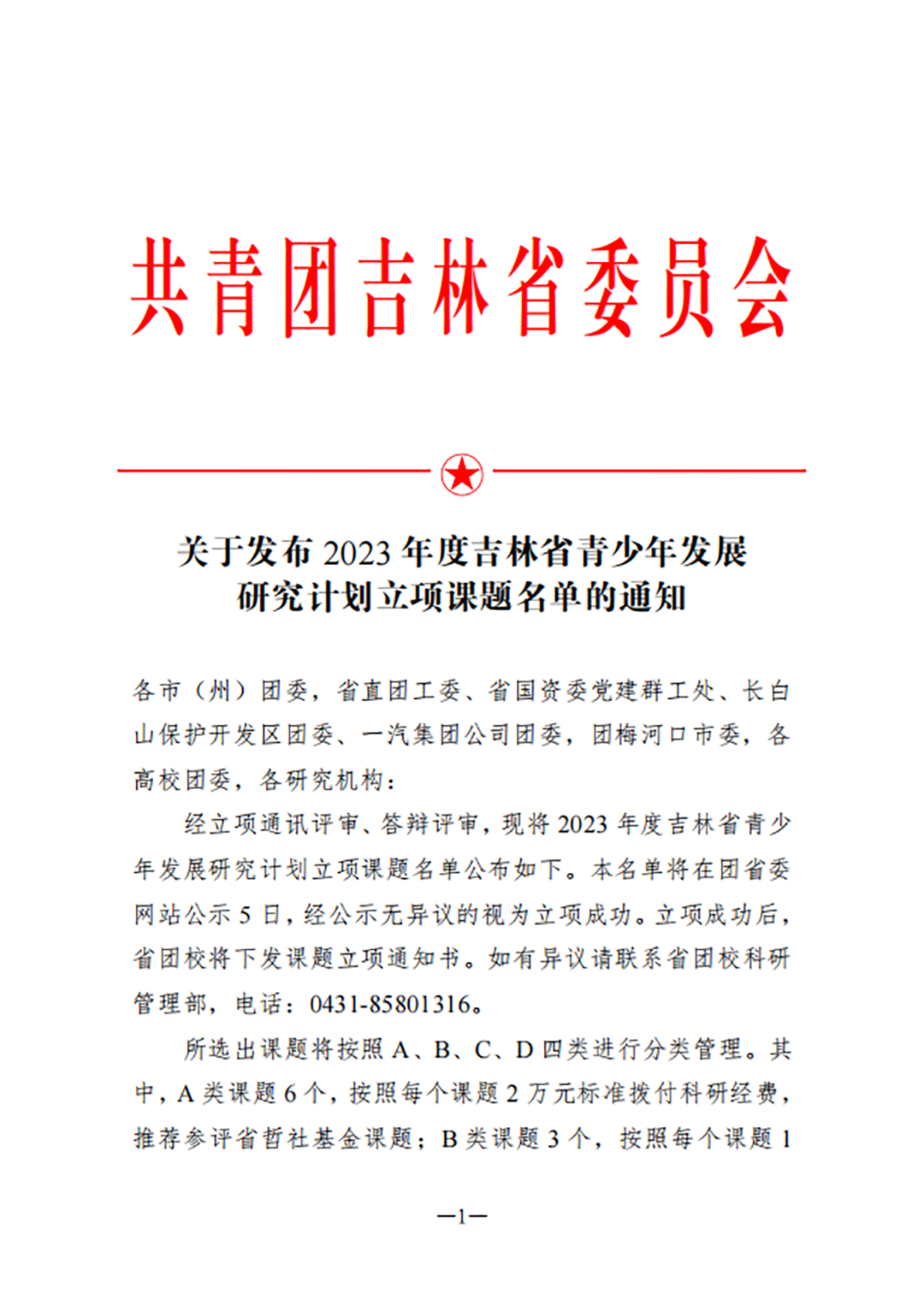 近日,共青团吉林省委员会下发《关于发布2023年度吉林省青少年发展研究计划立项课题名单的通知》,永利官网共有21项课题获批一般项目立项,获批项目总数创永利官网该课题立项总数的历史新高。