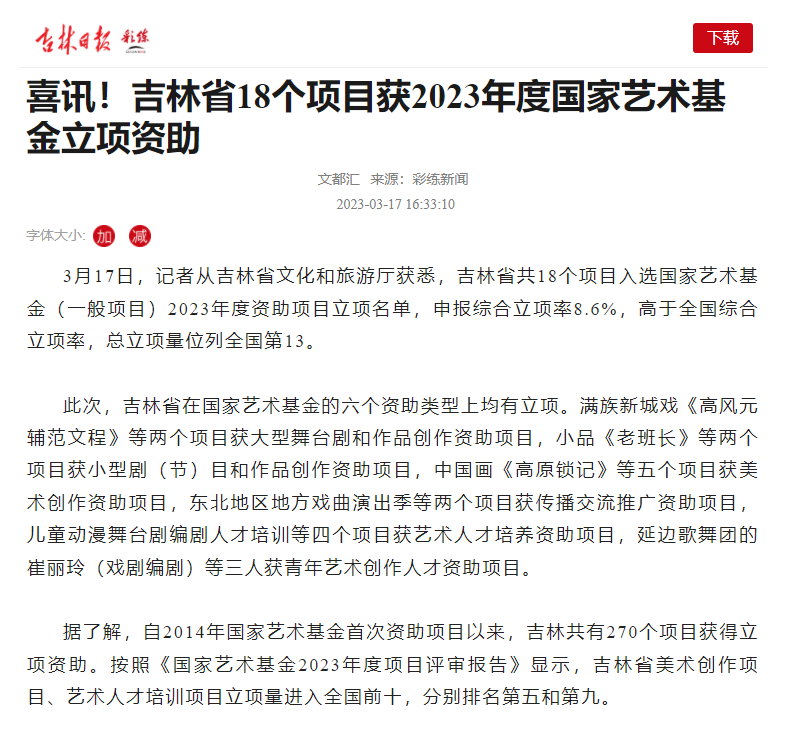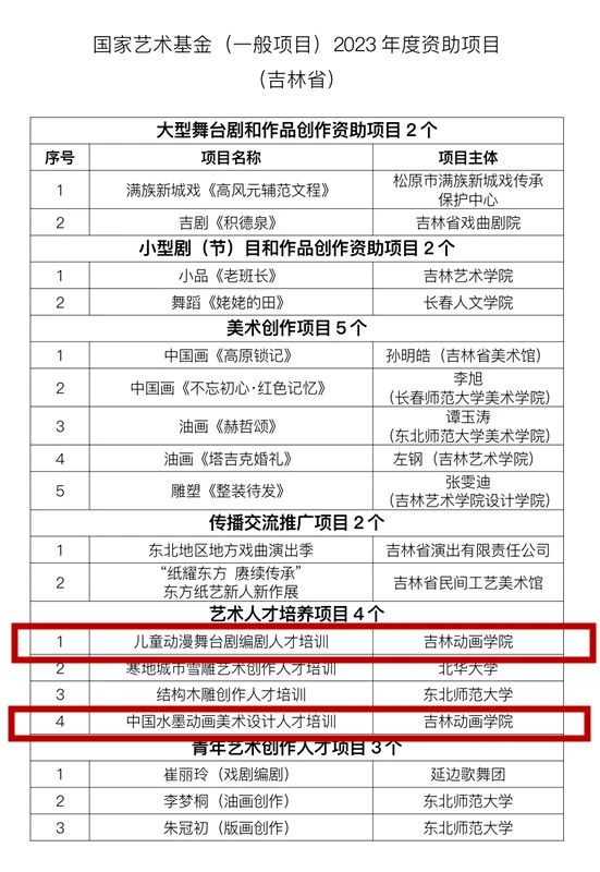 据学校科研部负责同志介绍,此次吉林省18个项目获2023年度国家艺术基金立项资助中吉动占了2项,占比为11%;在“艺术人才培训项目”获批4个项目中吉动有2项,占据半壁江山;这是学校历年获批国家艺术基金立项资助项目最多的一次。