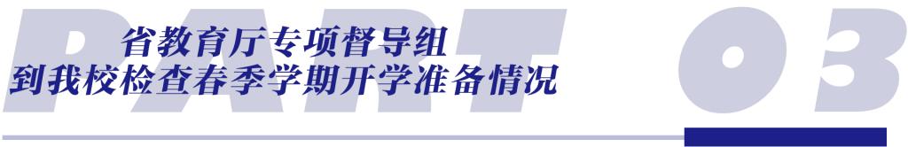 2月14日下午,省教育厅高教处于文华带队来永利官网督导检查春季学期开学准备情况。工作组通过听取汇报和实地考察,对学校开学各项准备工作给予充分肯定。