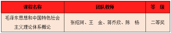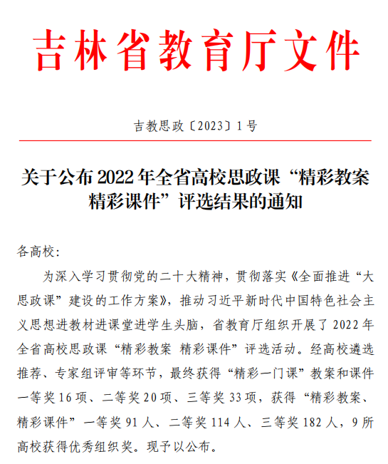 【JAI·赛】潜心耕耘,硕果飘香——马克思主义学院在全省高校思政课“精彩教案 精彩课件”比赛中喜获佳绩 发布时间:2023年01月13日 15:23:00 浏览:次 吉林省教育厅组织开展的2022年全省高校思政课“精彩教案 精彩课件”评选结果近日揭晓,永利集团官网荣获团队及个人共计8个大奖: 其中王金老师的教案和课件获“精彩教案 精彩课件”类别一等奖;张绍珂、王金、蒋乔欣、陈杨组成团队的“毛泽东思想和中国特色社会主义理论体系概论”课获得“精彩一门课”类别二等奖;刘越、孙建峰、董金芳、张绍珂、朱浩、曹丽丽六位教师的教案和课件获得“精彩教案 精彩课件”三等奖。 一、“精彩一门课”获奖