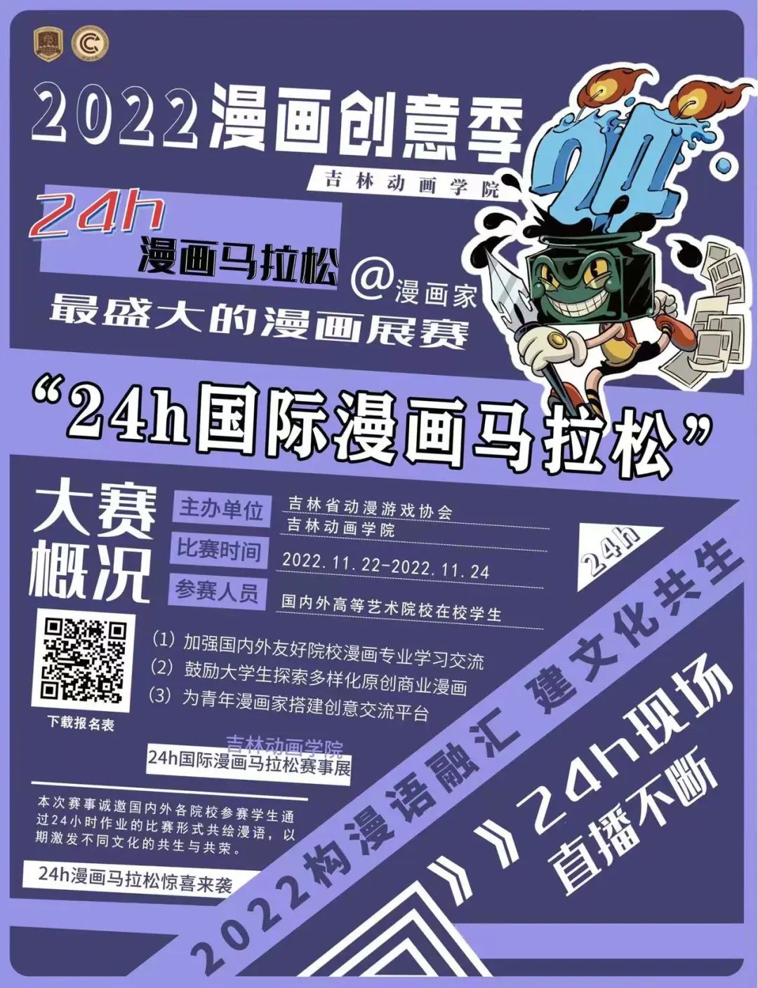2.2022年11月18日前,将签名的电子报名表,通过电子邮件发送至本赛事官方邮箱:552197734@qq.com,邮件主题为“24小时国际漫画马拉松+姓名”。