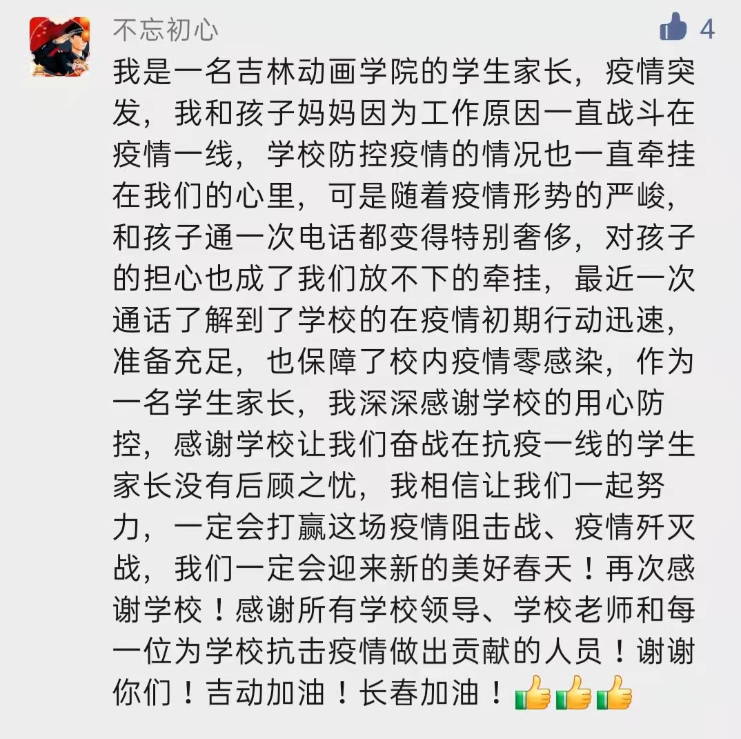 网名“不忘初心”的家长说:“我是一名永利集团官网的学生家长,疫情突发,我和孩子妈妈因为工作原因一直战斗在疫情一线。学校防控疫情的情况也一直牵挂在我们的心里。......最近与孩子一次通话了解到学校的在疫情初期行动迅速,准备充足,也保证了现阶段校内疫情零感染。作为一名学生家长,我深深感谢学校的用心防控,感谢学校让我们奋战在抗战一线的学生家长没有后顾之忧,.....长春加油!”