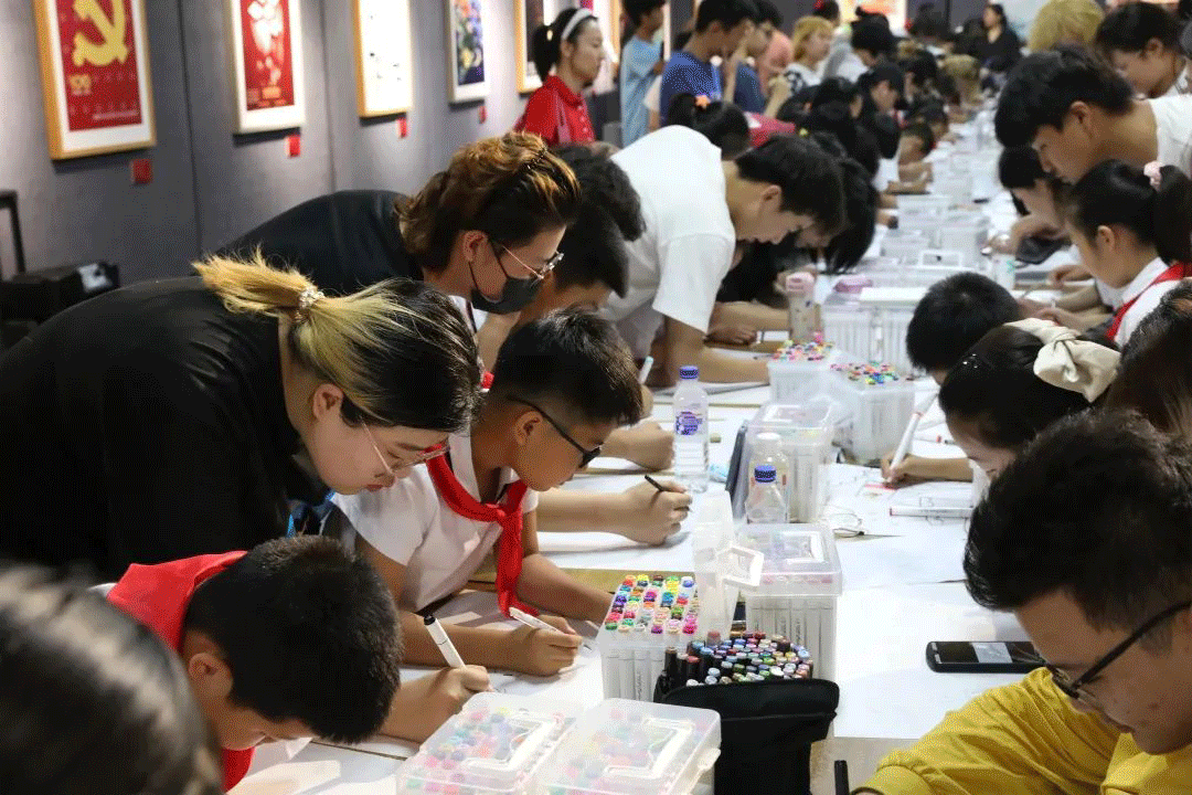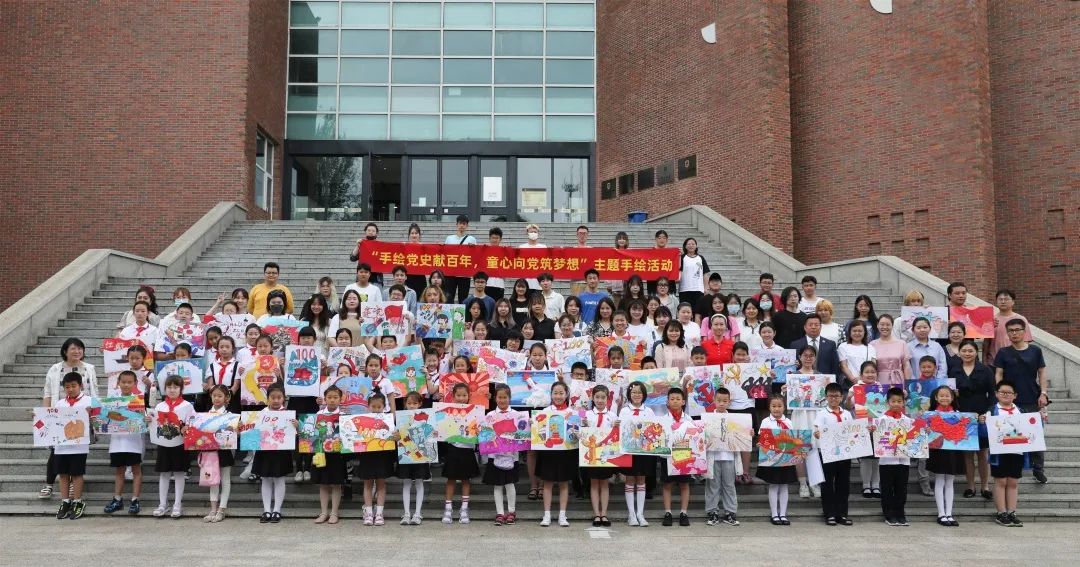 在活动现场,永利官网50名大学生和东北师范大学附属小学繁荣校区50名小学生共同创意、共同完成了50幅绘画作品。学生们用画笔描绘出了心中最美的画卷,表达出对中国共产党成立100周年的美好祝福:鲜红的党旗、雄伟的天安门、绵延的万里长城、秀丽的祖国山河……在学生的笔下一一呈现,形式多样,生动传神。