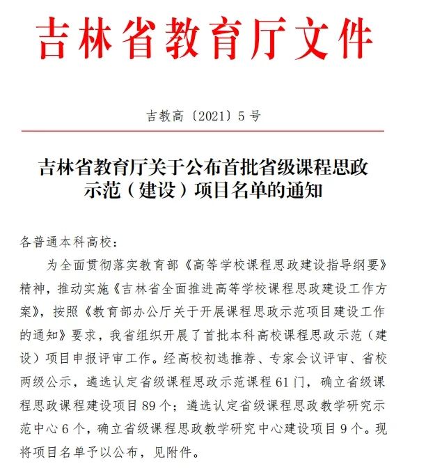 近年来,学校深入贯彻落实《高等学校课程思政建设指导纲要》(教高〔2020〕3号),根据中共吉林省高校工委、吉林省教育厅《吉林省全面推进高等学校课程思政建设工作方案》(吉教高〔2020〕25号)等文件要求,全面推动课程思政改革,强化课程思政建设水平,学校出台了《永利集团官网“课程思政”教学改革试点工作方案》《永利集团官网全面推进课程思政建设工作实施方案》等文件,开展了“学科育人示范课程”“课程思政示范(建设)项目”“课程思政教学研究项目”“课程思政教学案例库”等一系列建设工作,深挖各类课程的思政育人功能,提升立德树人成效和人才培养质量。