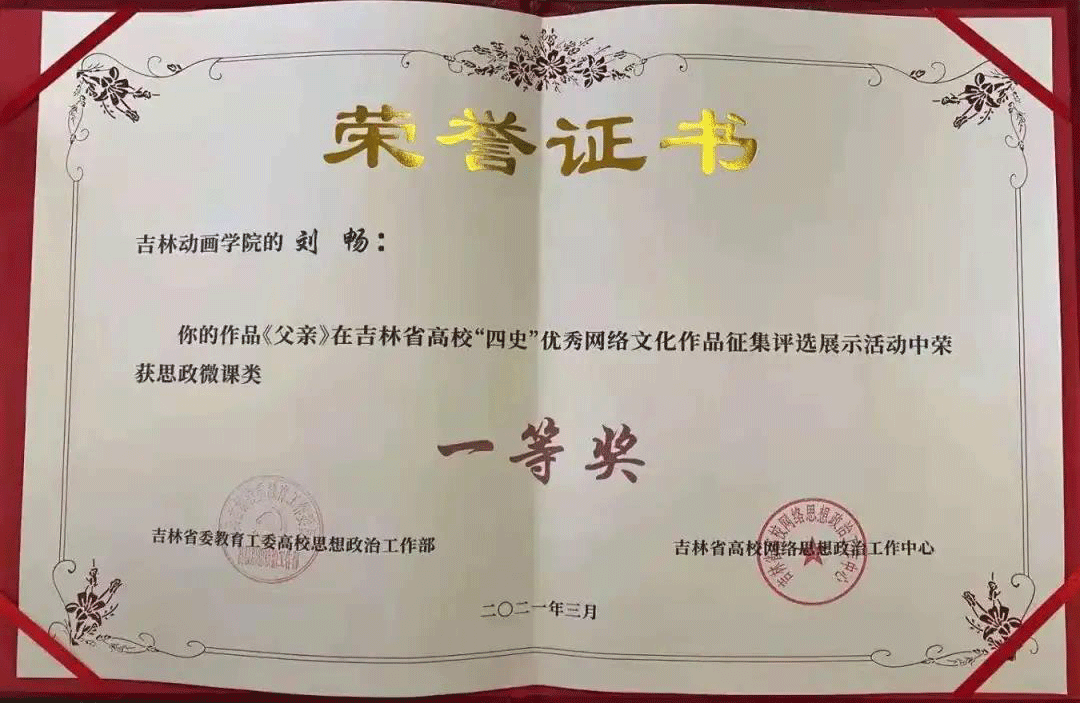 为深入贯彻落实习党史、新中国史、改革开放史、社会主义发展史(简称“四史”)学习的重要指示精神,持续深化爱国主义教育,吉林省委教育工委高校思政部、省高校网络思想政治工作中心联合组织开展了全省高校“四史”优秀网络文化作品征集评选展示活动。经过专家评审,五大类作品共评选出一等奖32个,永利集团官网动画艺术学院的作品《父亲》和《爷爷的故事》荣获“思政微课类”一等奖。