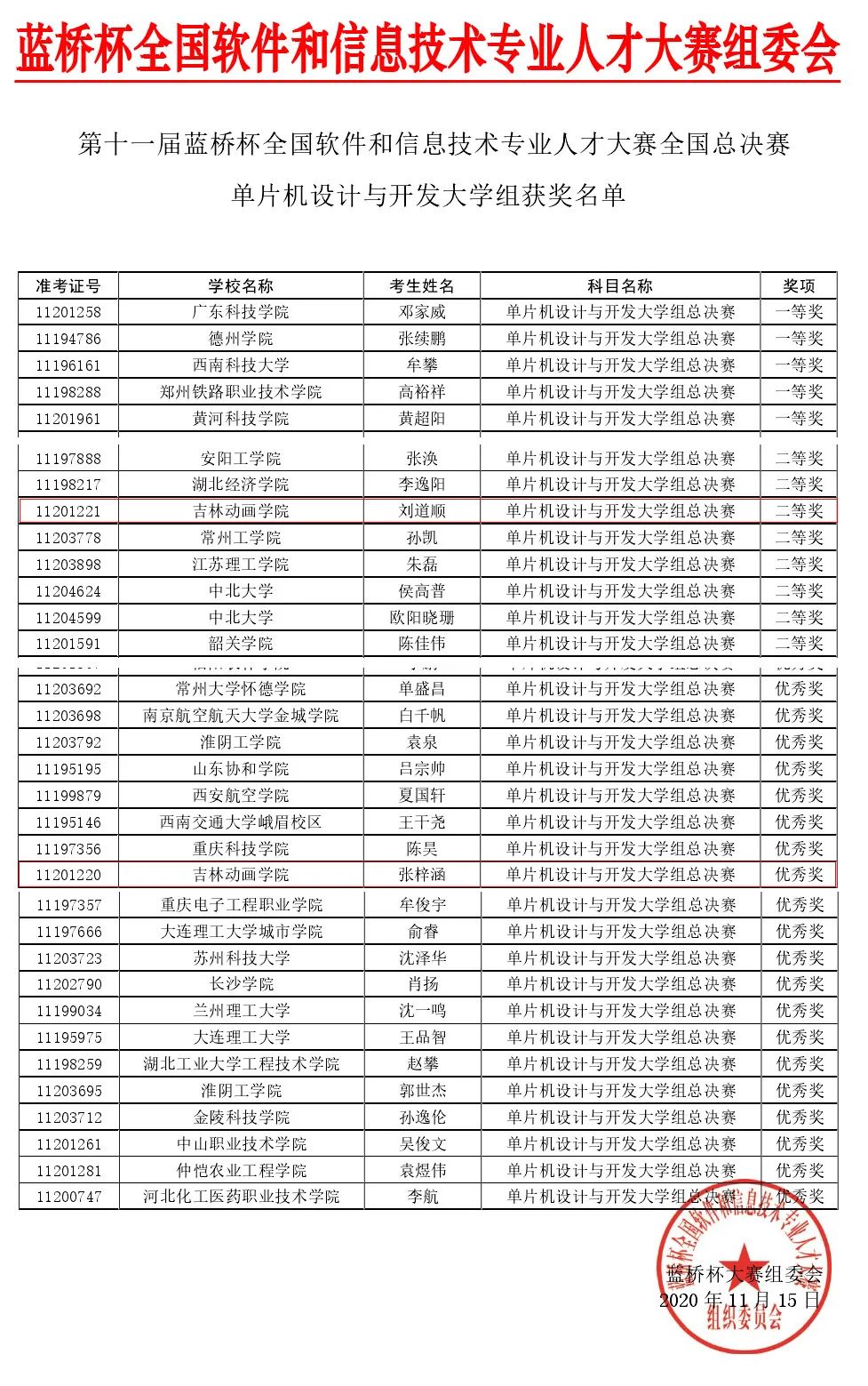 11月14日,第十一届蓝桥杯全国软件和信息技术专业人才大赛全国总决赛圆满结束。永利集团官网民航学院2017级飞行器制造工程专业刘道顺获 “单片机设计与开发”大学组二等奖,张梓涵获得了“单片机设计与开发”大学组优秀奖,永利集团官网获得了“优秀组织单位”奖。