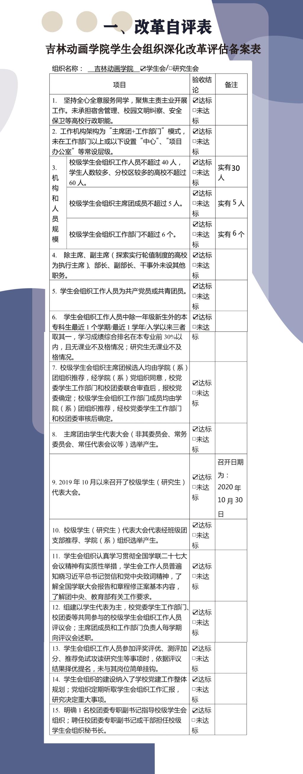 永利集团官网学生会组织改革情况 发布时间:2020年11月17日 16:43:10 浏览:次 | 改革自评表 | |永利集团官网学生会章程| | 校级组织工作机构组织架构图 | | 校级组织工作人员名单 | | 校级组织主席团成员候选人产生办法及选举办法 | | 校级学生代表大会召开情况 | | 校级学生代表大会产生办法 | | 校级组织工作人员述职评议办法 | | 学校党委指导学生会组织工作情况 | | 校团委指导学生会主要责任人 |