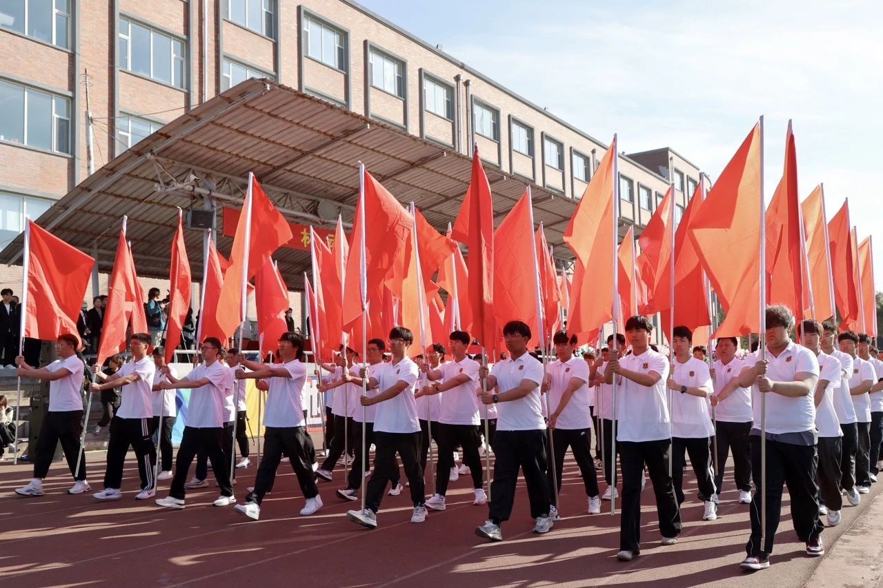 早晨八点,伴随着激昂的旋律,国旗护卫队迈着坚定的步伐引领着校旗护卫队、刀旗队、花束方队、女子持枪连方队、男子劈枪连方队以及由各学院运动员代表队、教工代表队、吉林吉动文化艺术集团代表队组成的11支方队依次走过主席台,接受大会检阅。在雄壮的国歌声中,五星红旗冉冉升起、高高飘扬。