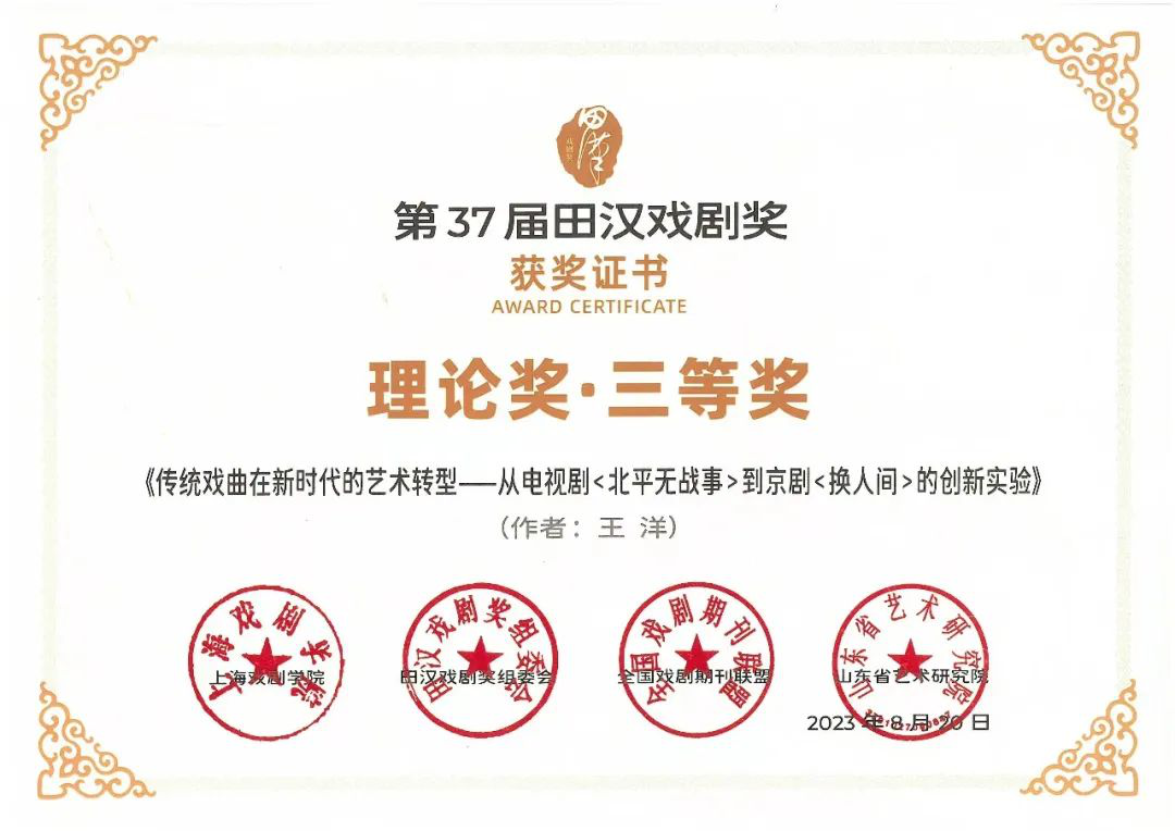 日前,2023年第三十七届田汉戏剧奖揭晓。永利官网电影学院教师王洋凭借理论文章《传统戏曲在新时代的艺术转型——从电视剧<北平无战事>到京剧<换人间>的创新实验》在本届评选中脱颖而出,喜获理论奖三等奖。这是永利官网首次获得田汉戏剧奖,实现了历史性突破。