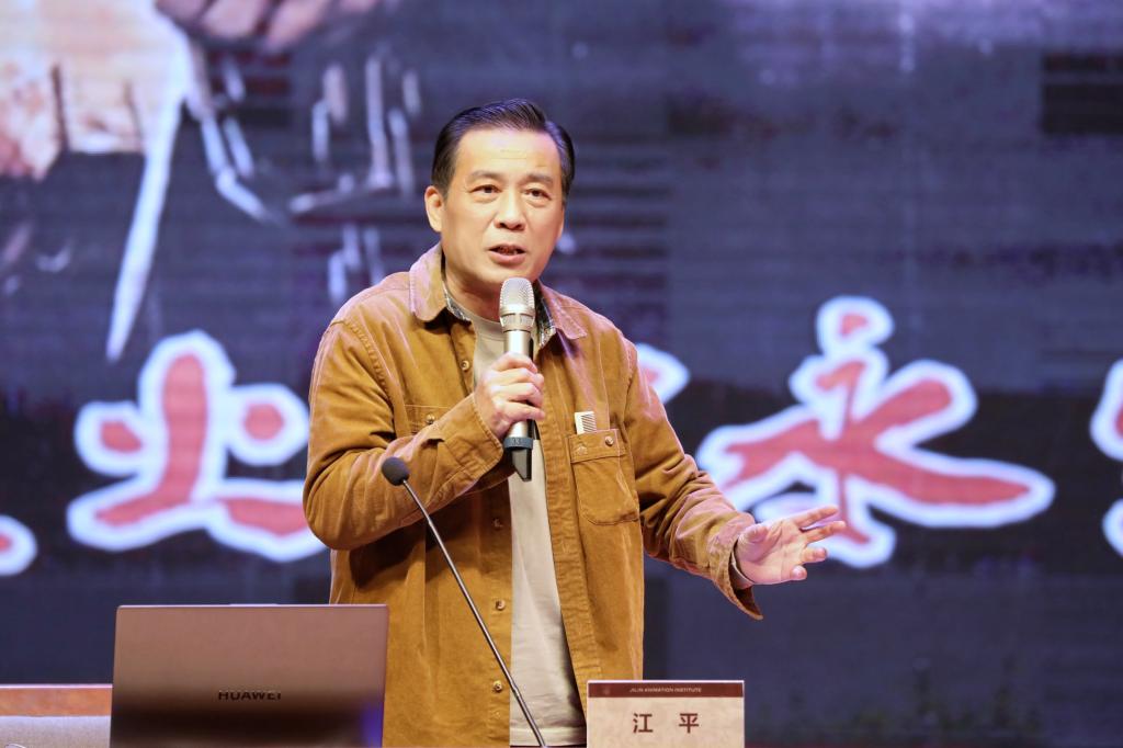 中国夏衍电影学会会长、国家一级导演,学校特聘教授、艺术监制江平做报告