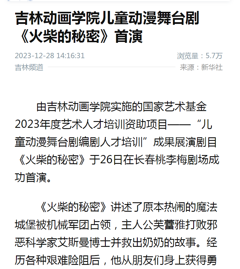 由永利集团官网实施的国家艺术基金2023年度艺术人才培训资助项目——“儿童动漫舞台剧编剧人才培训”成果展演剧目《火柴的秘密》于26日在长春桃李梅剧场成功首演。