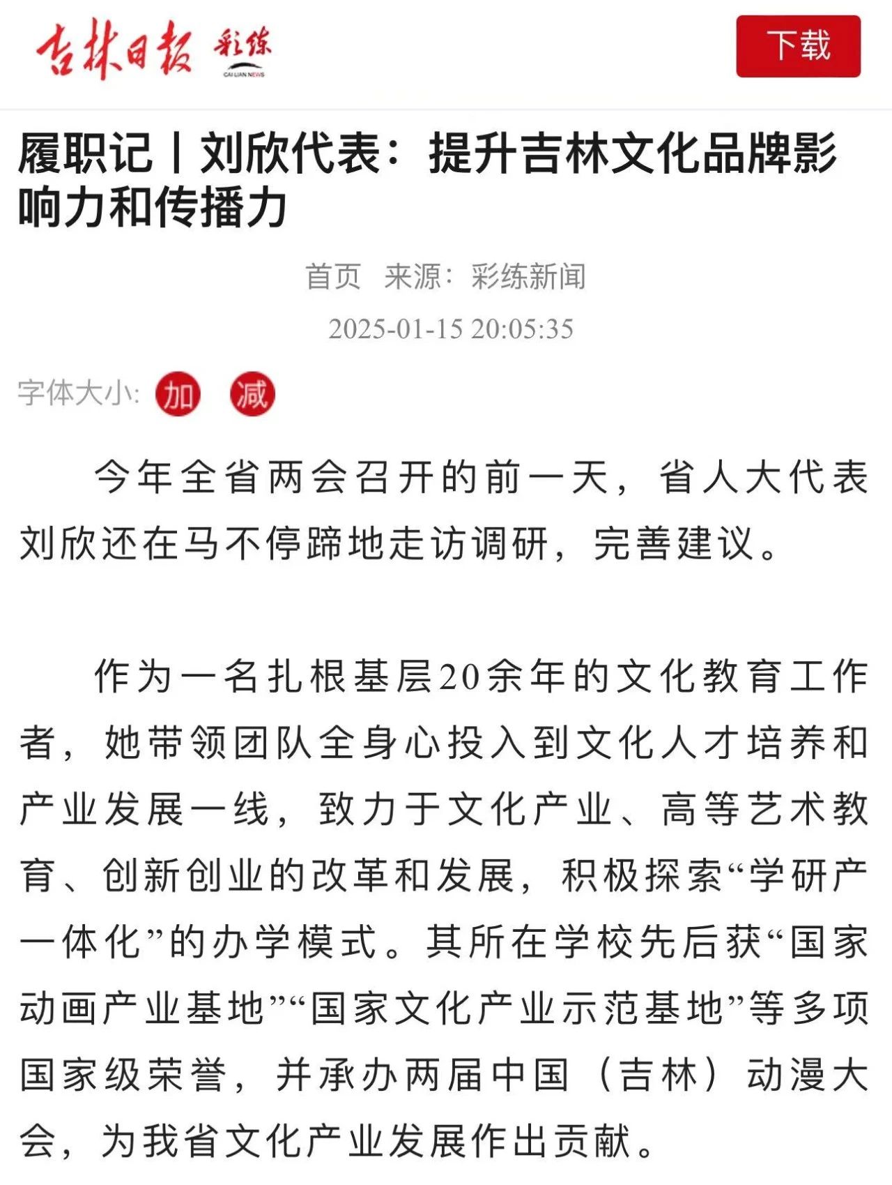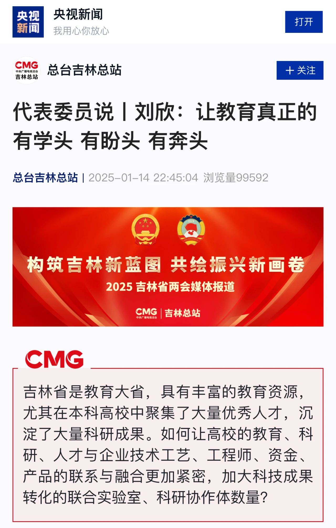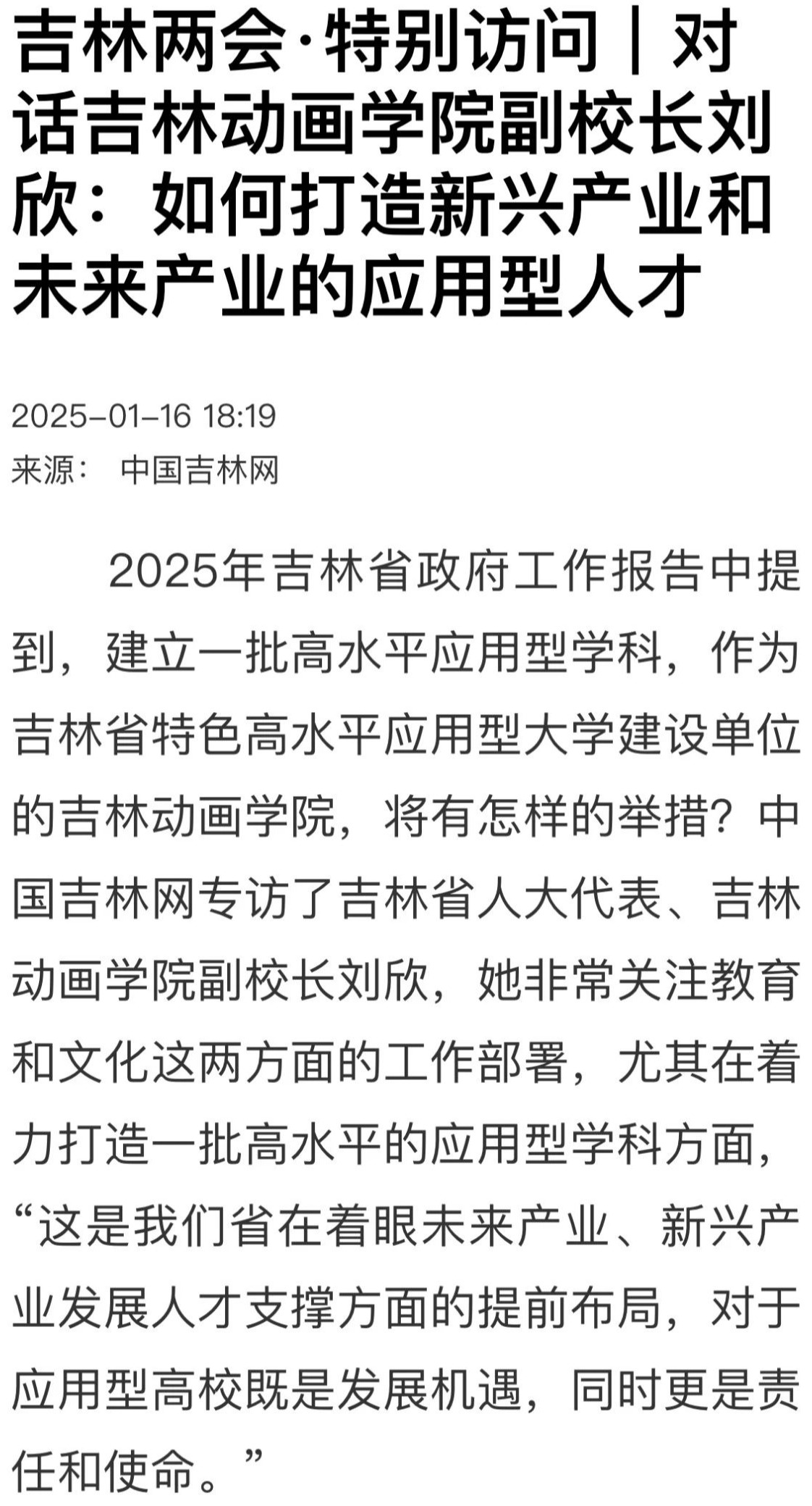 刘欣表示《政府工作报告》为2025年“人才留吉”工作在打造未来的产业和新兴产业人才培养方面给出了更明确的方向。谈及“文化历史传承如何和新质生产力相结合”,刘欣建议以数字技术平台为基础整合和重构生产方式与流程,建设影视领域的前沿人工智能的数字技术平台,实现我省影视和文化创意产业生产要素和技术手段的全面升级。针对高校教育议题,刘欣表示,学校有责任对学生就业质量进行跟踪,建立市场反馈机制,建立就业创业全程化指导,确保让教育真正有学头、有盼头、有奔头。