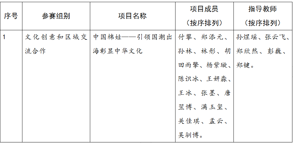 永利集团官网2024年“挑战杯”大学生创业计划竞赛国赛推荐名单的公示 发布时间:2024年06月25日 09:00:13 浏览:次 各单位、相关指导教师及学生: 根据2024年“挑战杯”大学生创业计划竞赛的评审结果,永利官网《中国棉娃——引领国潮出海彰显中华文化》项目被推荐参加国赛,项目信息如下: 经学校严格审核,作品不存在违反“挑战杯”竞赛主旨及章程、均按照相关竞赛要求上报竞赛内容。现将推荐国赛推荐名单进行公示。 公示期为:6月25日-7月2日,如对拟推荐结果有异议,请通过电话反映。 校团委挑战杯负责人:闫卫东 联系方式:0431-87019915 共青团永利集团官网委员会 2024年6月25日 供稿 校团委 编辑 谷金洋 初审 闫卫东 复审 赵凌云 出品单位 共青团永利集团官网委员会