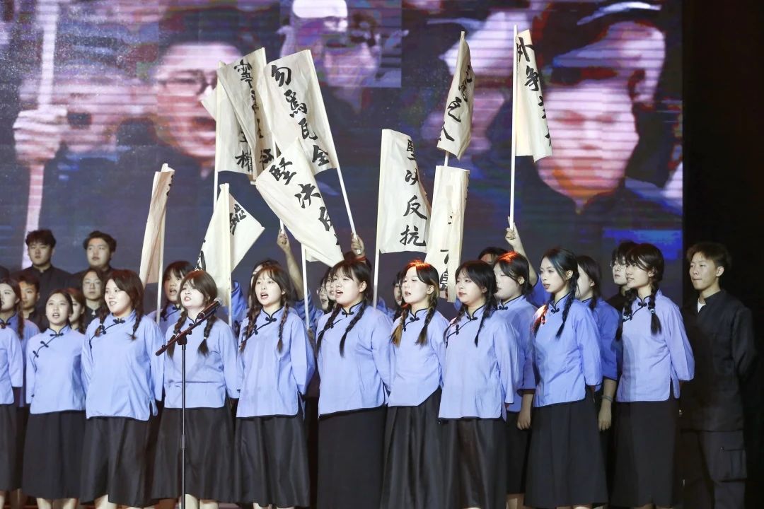 开场舞蹈《无名的功勋》,带我们回到了那个一寸山河一寸血,一捧热土一捧泪的年代。不同职业身份的小人物们,进行着共同的地下工作,各行各业凝结在一起为中华民族的绝地反击奉献热血,只为了那一份重要情报的传递;音乐情景剧《如愿》在“外争主权,内除国贼。誓死力争,还我青岛”的震天响的口号中步入舞台,将我们带回到国难当头,青年奋起守卫家国的1919年,“我以我身斗魑魅,我以我血斩魍魉;无惧生死,无惧牺牲!”是百年前的青年们斩破时间的跨度,向我们传递的勇气。话剧诗朗诵《新少年中国说》带领我们穿越百年,重温经典名篇《少年中国说》,以今天中华经典的铿锵音韵,在我们耳边诉说着天地苍苍,乾坤茫茫,中华少年,顶天立地当自强。