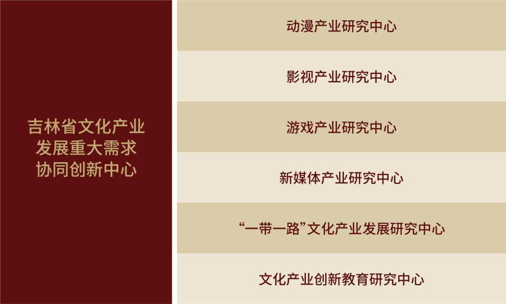 吉林省文化产业发展重大需求协同创新中心,2015年在吉林省科技厅的批准下立项建设。中心重点关注我省文创产业建设和经济发展需求,以技术与艺术融合推动为着力点,围绕文化产业未来发展趋势和特征,聚焦文化产业人才培养、中华优秀传统文化传承、科技赋能文化产业问题三大核心研究领域,持续开展新时代中国文化产业发展、数字文化产业人才培养体系建设两个系列研究。全力打造一带一路文化产业研究联盟、文化产业研究与实践基地、基于AIGC的数字文化互联网营销平台的“一联盟、一基地、一中心”协同创新格局。中心积极开展各纵、横向课题,在学术研究、决策咨询、国际交流工作,累计开展省部级以上项目30项、发表学术论文43篇、省级及以上 教学成果奖13项、完成社会服务类项目百余项、开展学术交流活动18场。