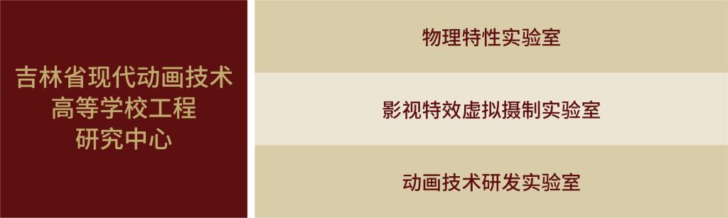 吉林省现代动画技术高等学校工程研究中心,2007年在吉林省教育厅的批准下立项建设。中心围绕影视动画、物理特效、虚拟影像拍摄等领域,主要开展数字特效技术、虚拟影像技术、动画技术、物理特效技术等关键技术的研究。主要开展的项目包括“山海之战2”“传说之影”“宝贝历险记”等。中心先后参与了国家科技部科技支撑计划项目、吉林省科技厅“双十工程”重大科技成果转化项目等科研项目 10余项,围绕关键技术发表科研论文 41 篇,软件著作权 13 项,专利 3 项,支撑师生作品获奖 190 项,开展 45 部社会服务项目。中心不断激发创新意识,提供创新驱动的支持和机制,推动动画产业持续创新。